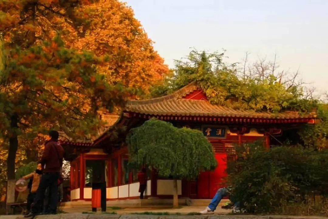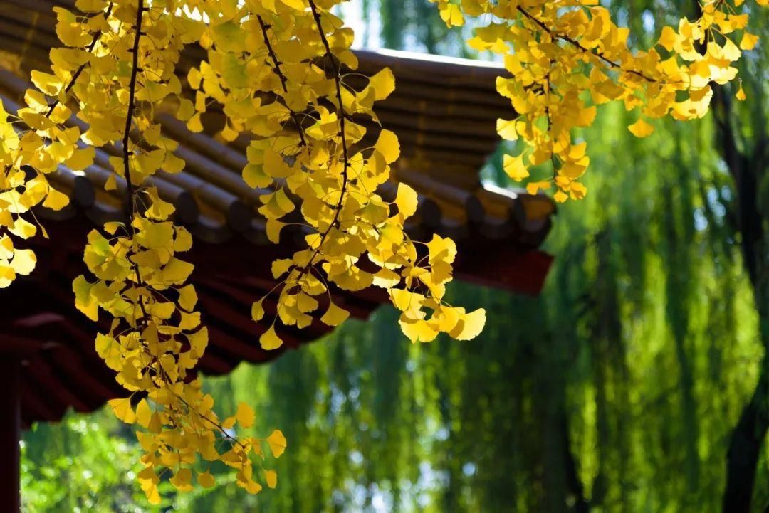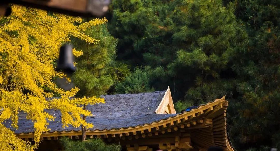 走近树下仰望,枝条上树叶层层叠叠,十分密实,藏匿在秋叶之后的仿古建筑,散发着丝丝禅意。