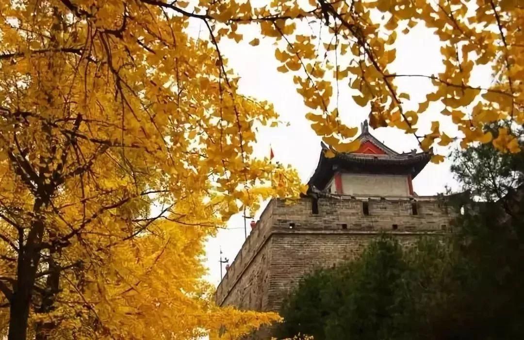 站在城墙之上赏银杏,阳光透过枝叶,叶片晶莹剔透,熠熠生辉,金光灿烂,可以说是非常生动了。