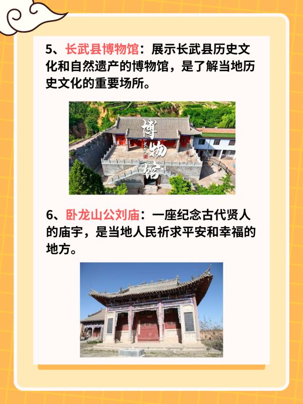 长武县博物馆是展示长武县历史文化和自然遗产的重要场所。博物馆内陈列着许多珍贵的文物和历史遗迹,如新石器时代的石器、商周时期的青铜器、汉唐时期的陶瓷等。这些文物和遗迹展示了长武县的历史演变和文化传承,使游客能够更深入地了解当地的历史和文化。