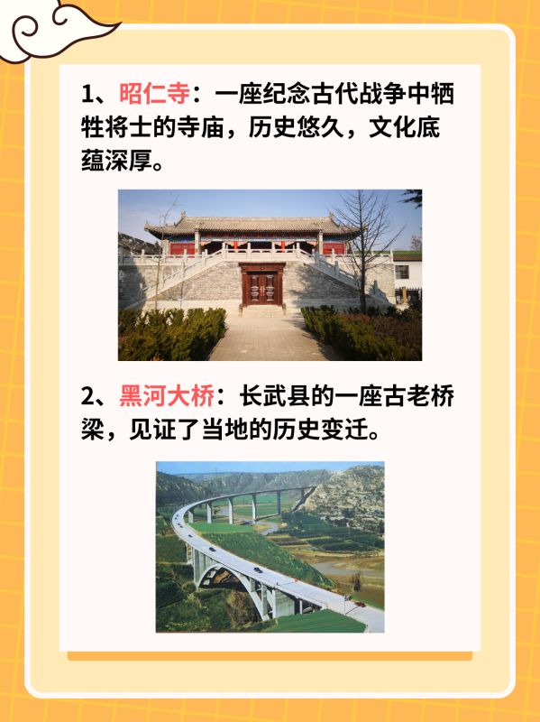 你是想问长武有哪些旅游景点吧?长武旅游景点有昭仁寺、青龙山景区、长武县博物馆、长武县红星森林公园景区等。