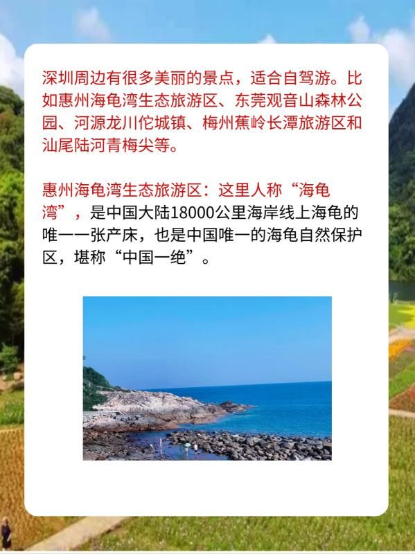 深圳周边有很多美丽的景点,适合自驾游。比如惠州海龟湾生态旅游区、东莞观音山森林公园、河源龙川佗城镇、梅州蕉岭长潭旅游区和汕尾陆河青梅尖等。