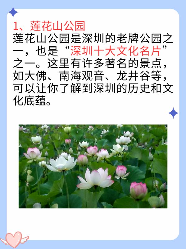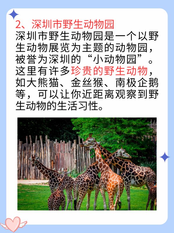 莲花山公园是一个了解深圳历史和文化的好地方,赏花也是一大乐趣。深圳市野生动物园则可以近距离观察到珍贵的野生动物。大梅沙海滨公园则是一个享受海滩美景和阳光沐浴的好去处,还有各种休闲娱乐设施。锦绣中华·民俗村则展示了中国的传统文化和历史,春天赏花更是美不胜收。梧桐山则是登山、观景和泡温泉的好去处。每个景点都有其独特的魅力和乐趣,可以根据你的兴趣和时间安排进行选择。