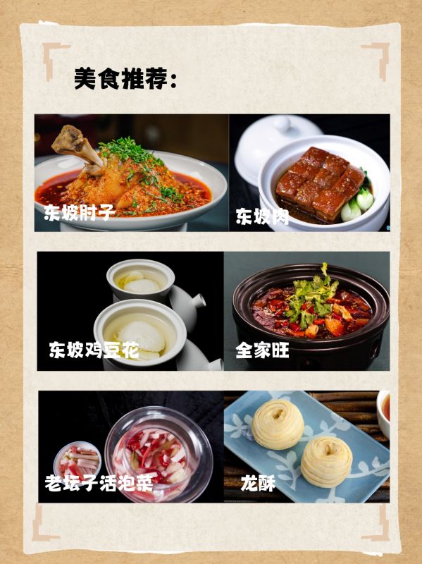 东坡肘子、东坡肉、鸡豆花、五柳鱼、龙酥、东坡松花蛋、干巴牛肉、冻粑、不知火、风酱腊肉、土鸡蛋、雪山笋、藤椒油、高庙白酒、野岩家蜂蜜、东坡泡菜、全家旺等