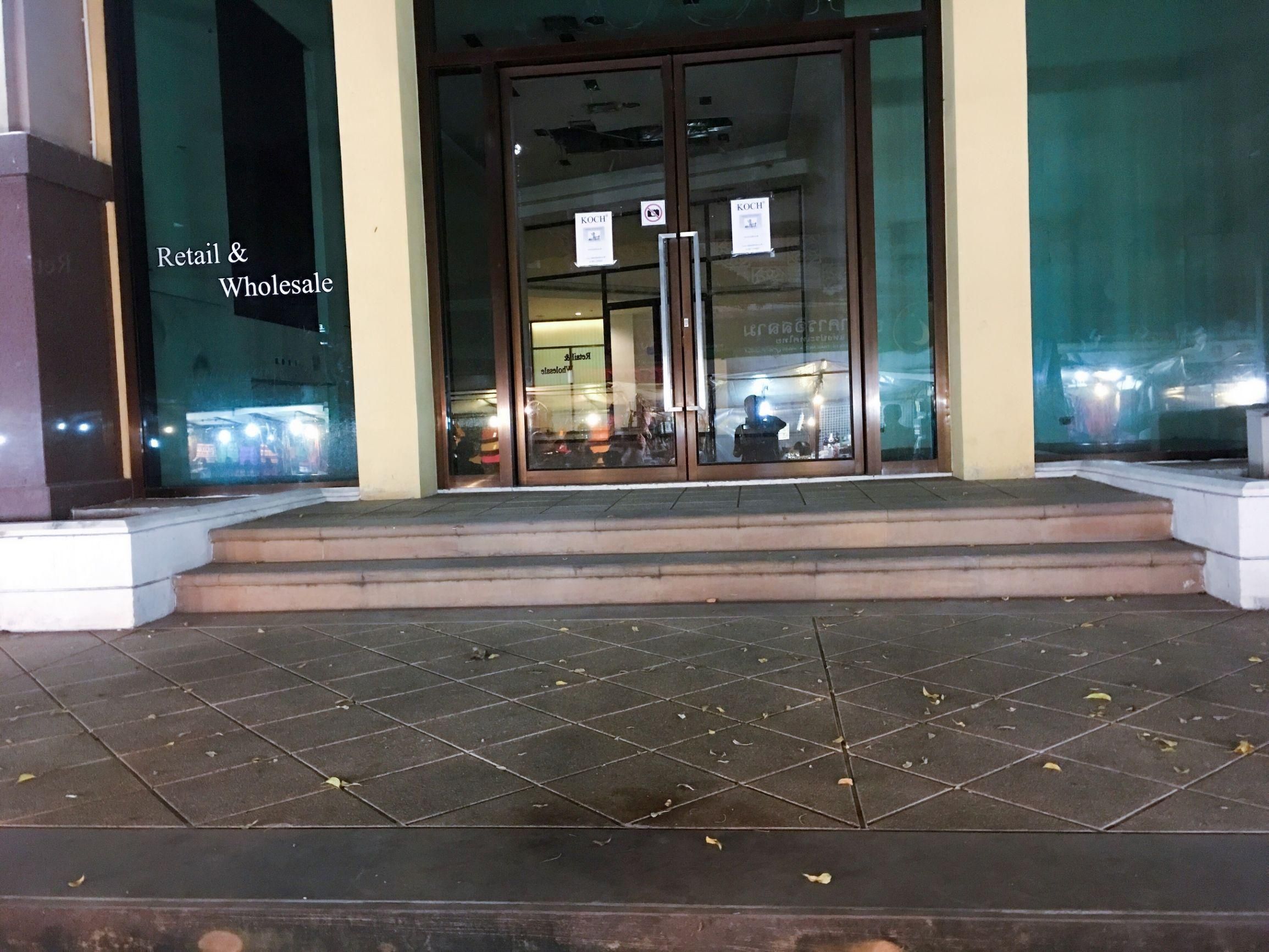 夜市旁边一家关了门的商场,门前除了一些落叶,完全没有垃圾。