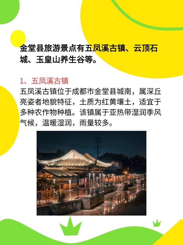金堂县旅游景点有五凤溪古镇、云顶石城、玉皇山养生谷等。