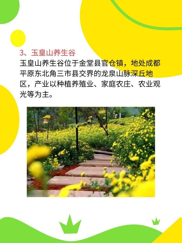玉皇山养生谷位于金堂县官仓镇,地处成都平原东北角三市县交界的龙泉山脉深丘地区,产业以种植养殖业、家庭农庄、农业观光等为主。