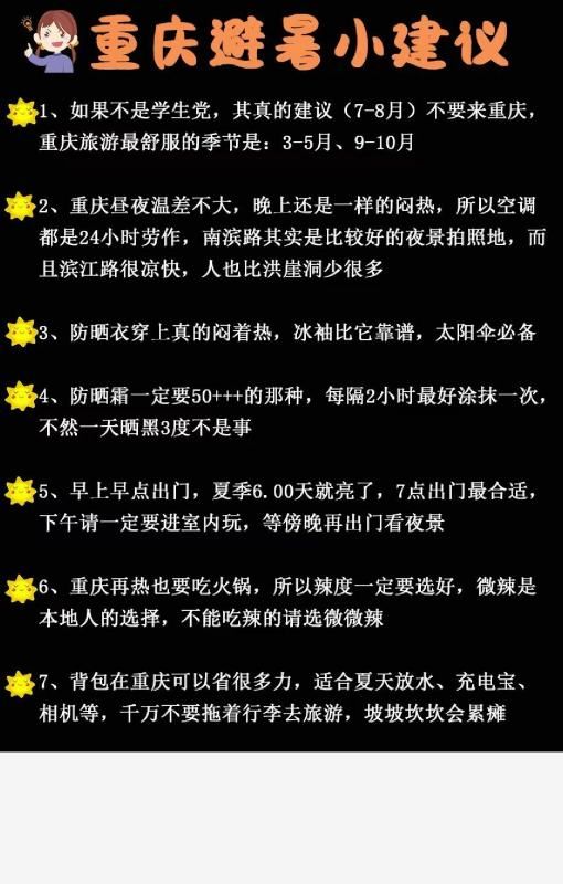 1、如果不是学生党,其真的建议(7-8月)不要来重庆,重庆旅游最舒服的季节是:3-5月、9-10月