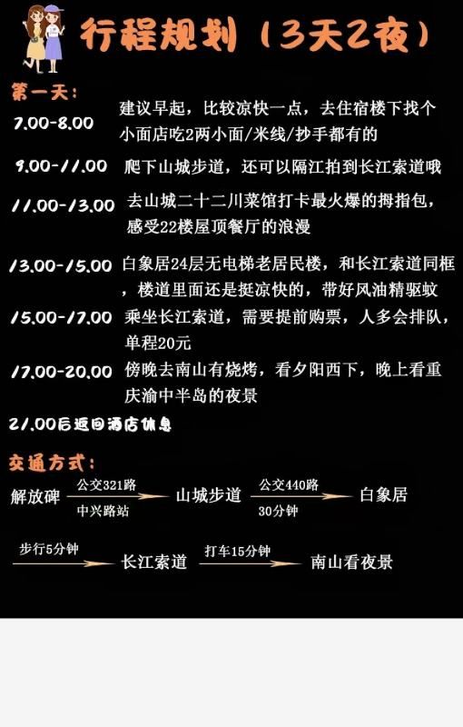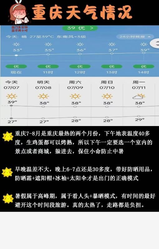 重庆7-8月是重庆最热的两个月份,下午地表温度40多度,生鸡蛋都可以烤熟,所以下午一定要选一个室内的景点或者商城,躲进去,保住小命防止中暑
