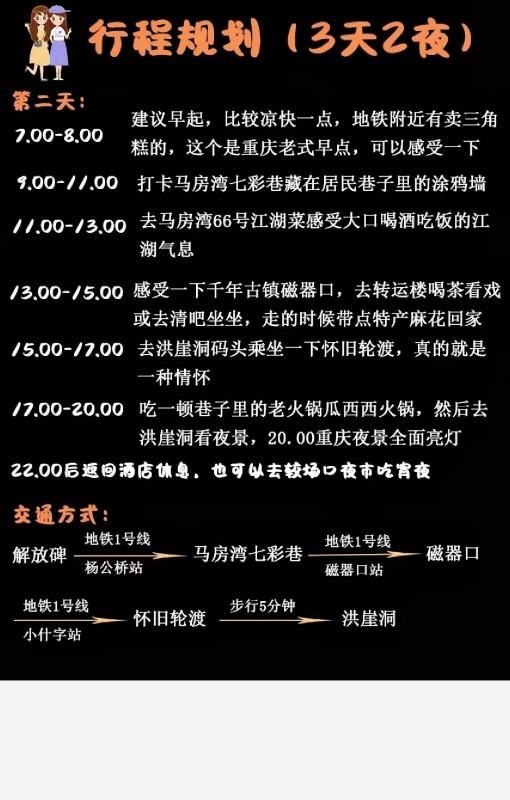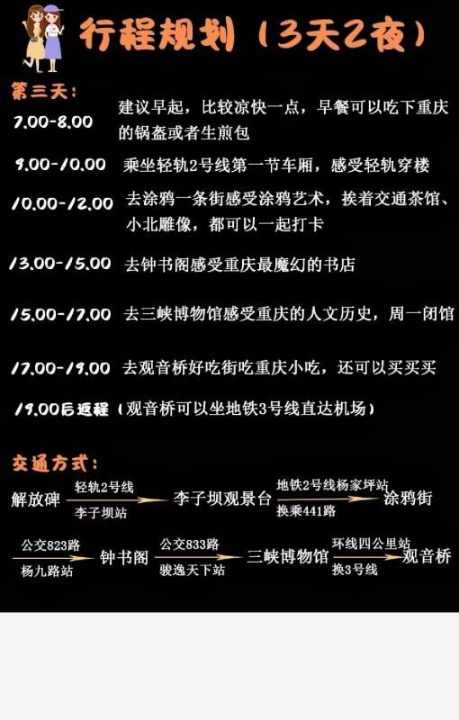 第三天:7.00-8.00建议早起,比较凉快一点,早餐可以吃下重庆的锅盔或者生煎包