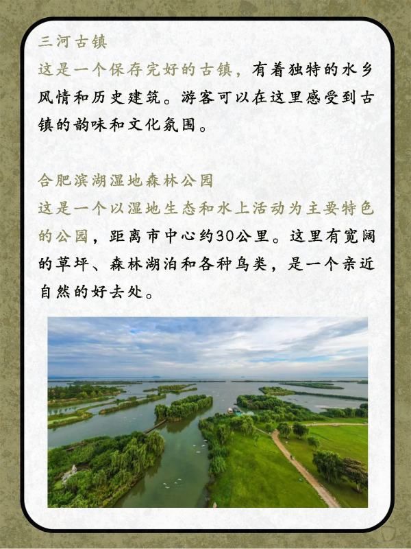合肥滨湖湿地森林公园:这是一个以湿地生态和水上活动为主要特色的公园,距离市中心约30公里。这里有宽阔的草坪、森林湖泊和各种鸟类,是一个亲近自然的好去处。