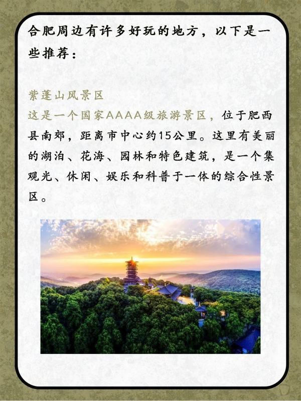 紫蓬山风景区:这是一个国家AAAA级旅游景区,位于肥西县南郊,距离市中心约15公里。这里有美丽的湖泊、花海、园林和特色建筑,是一个集观光、休闲、娱乐和科普于一体的综合性景区。