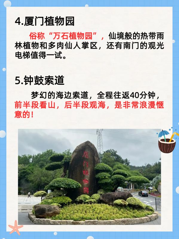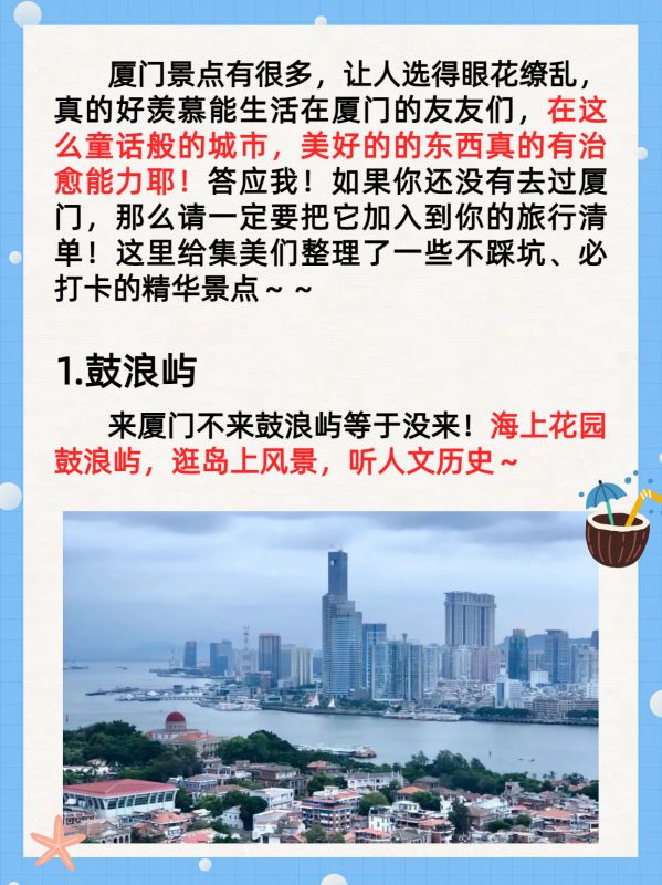 厦门的景点有很多,让人选得眼花缭乱,真的好羡慕能生活在厦门的友友们,在这么童话般的城市,美好的的东西真的有治愈能力耶!答应我!如果你还没去过厦门,那请一定要把它加入到你的旅行清单!这里给集美们整理了一些不踩坑、必打卡的精华景点~~