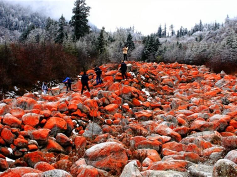 红石滩在毕棚沟3000米至4500米之间均有分布,这是一种特殊的红色苔藓,仅生存在特殊的海拔和地质条件下,也要求周边空气质量相当好。而毕棚沟最佳的红石观赏点就是红石滩,位于龙王海与上海的接待中心之间,成片的红石犹如玛瑙般镶嵌在溪沟和丛林之间。