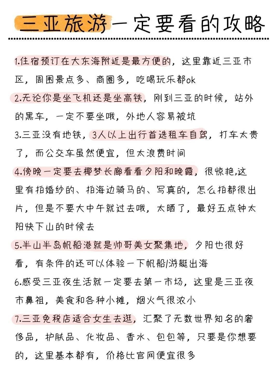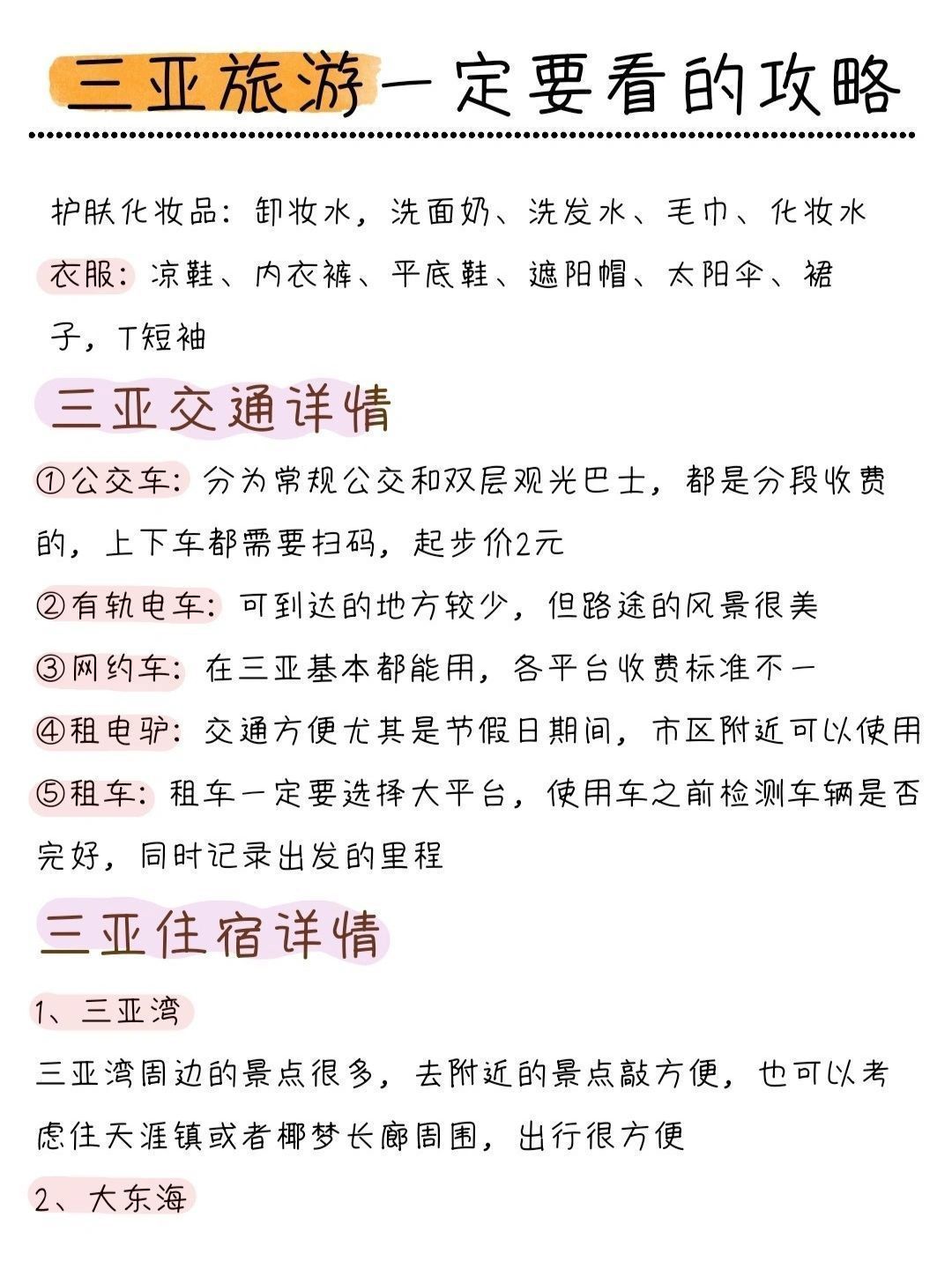 三亚住宿选择✨三亚湾:适合赶路和穷游党的选择。✨大东海:交通便利,性价比较高。✨亚龙湾:可以选择海景房,享受海滩度假。✨海棠湾:适合度假休闲的选择。