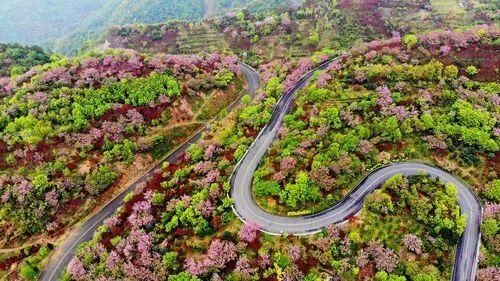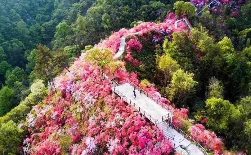 蜿蜒的道路两旁,映山红点缀其上,宛若一条花海的长廊,山花漫烂,万紫千红。