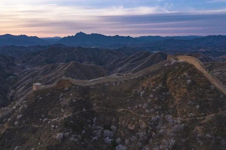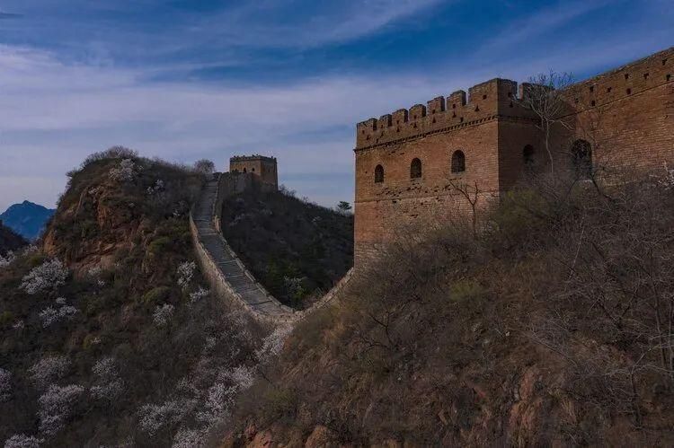 但是4月份的长城一下打破了固有形象,山桃花与杏花竞相盛放,花开漫山遍野,粉白如雪。犹如驰骋沙场的女将军换上大家闺秀的新装,美艳不可方物。