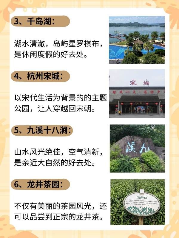 3、千岛湖:湖水清澈,岛屿星罗棋布,是休闲度假的好去处。