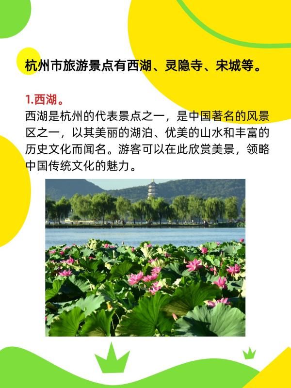 西湖是杭州的代表景点之一,是中国著名的风景区之一,以其美丽的湖泊、优美的山水和丰富的历史文化而闻名。游客可以在此欣赏美景,领略中国传统文化的魅力。