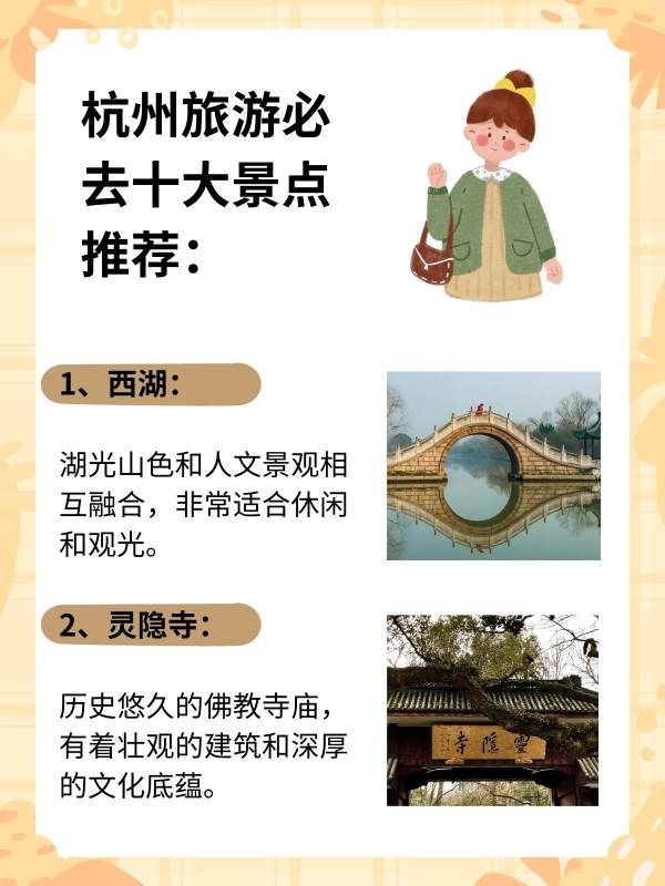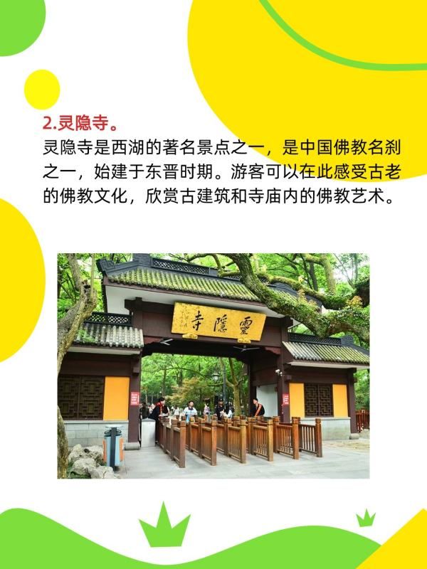 2、灵隐寺:历史悠久的佛教寺庙,有着壮观的建筑和深厚的文化底蕴。
