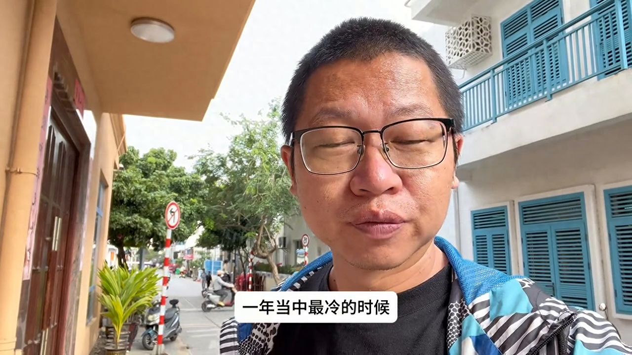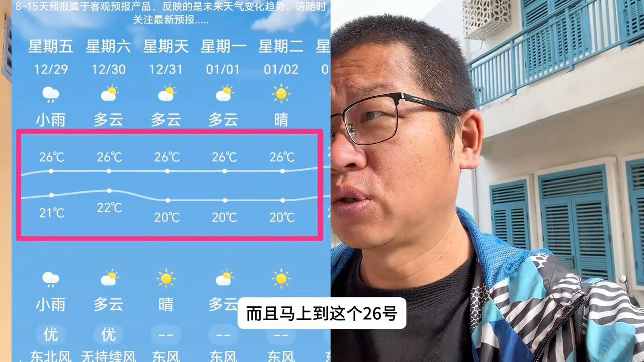 但是在三亚如果是骑电动车的,很多人也穿羽绒服,因为一骑起来他冷,他有风冷,所以说这个时候就这一身就行了。而且马上到26号,到月末就开始升温了,就没那么冷了。这个天气好了,我们这个环岛游继续。如果是人凑的齐凑的快,28号就出发,人凑的没那么快那就过了元旦,23号左右出发。