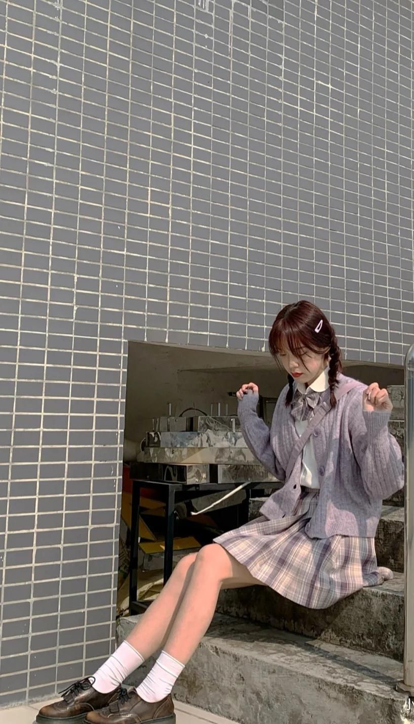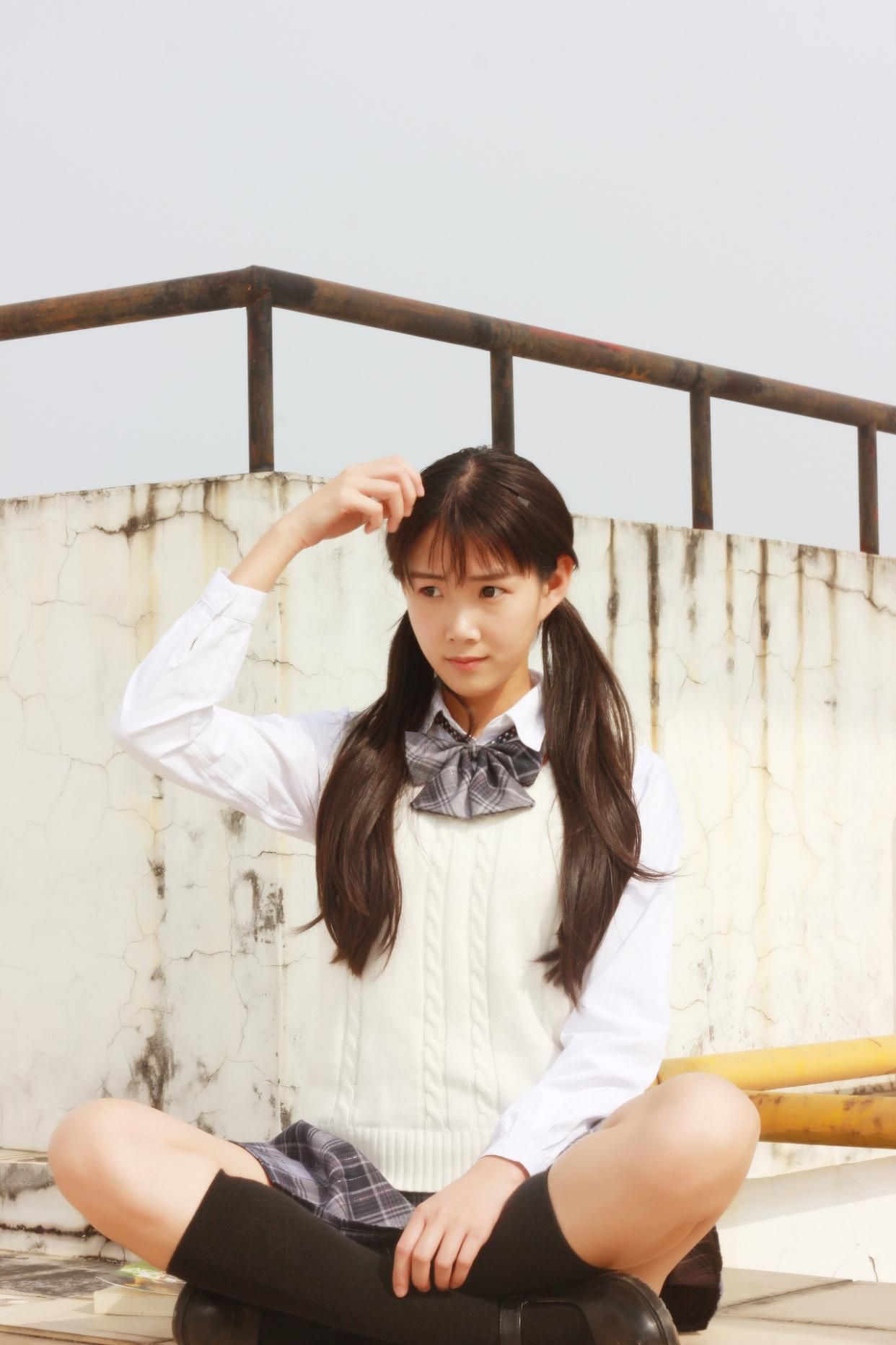 天台也是一个拍照片必不可少的场景了。盘腿坐在天台的栏杆前面,穿着白色的衬衣配上灰色格子的蝴蝶结领结,外面可以套一个白色的针织马甲,下半身穿一个灰色格子半裙,穿着JK制服,扎着两个马尾的我们拍出来的照片非常减龄。