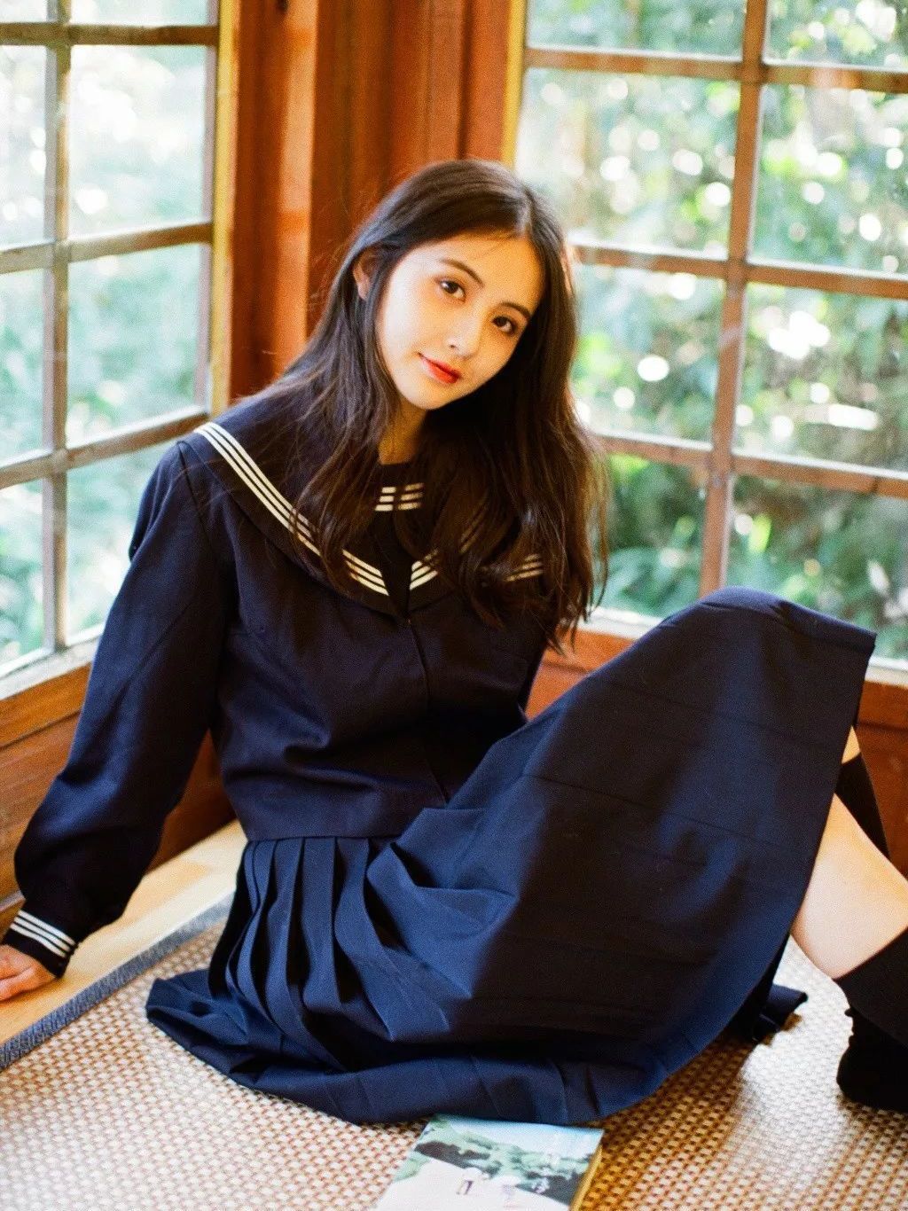 穿着深蓝色的海军衬衣配上深蓝色的长百褶裙,坐在一个洒满阳光的屋子里面,两只胳膊分别都向后伸展撑着地面,身子也微微向后倾,腿可以弯曲着就像图片这样坐在地上,头稍微往一边歪一下看向镜头微笑就可以啦。