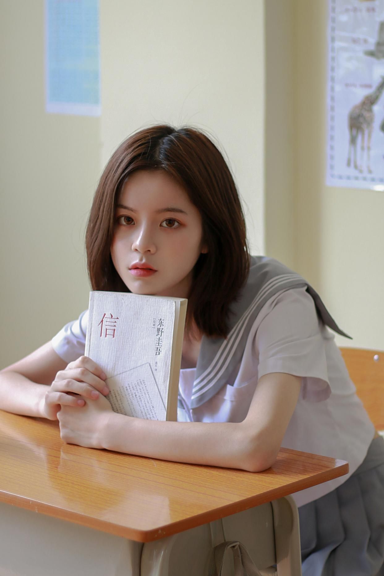 Jk制服也非常适合学生时代的我们穿搭,坐在教室里面,穿着上半身穿着白色的衬衫短袖,下半身穿着灰色的百褶裙,两只胳膊都放在课桌上面,手里可以拿一本书,脸可以搭在我们拿的书上面,对着镜头不用太多的表情就完成了。