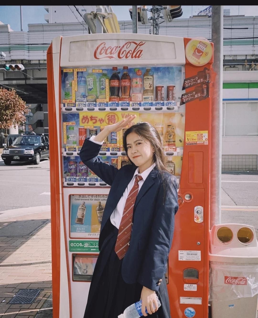 要想拍出好看的照片就要学会充分利用周边的一些设施。穿着白衬衣配上红色领带的我们,外面可以套一个深蓝色西装外套,下半身穿黑色半裙,手里拿着一瓶矿泉水站在自动饮料机面前,一只手可以抬起来做出遮挡阳光的动作,面对镜头微笑,照片就非常有日系的感觉。