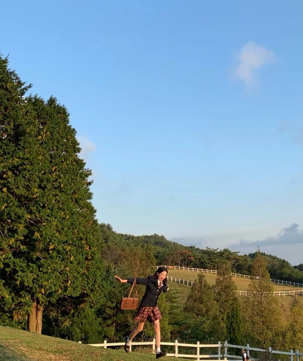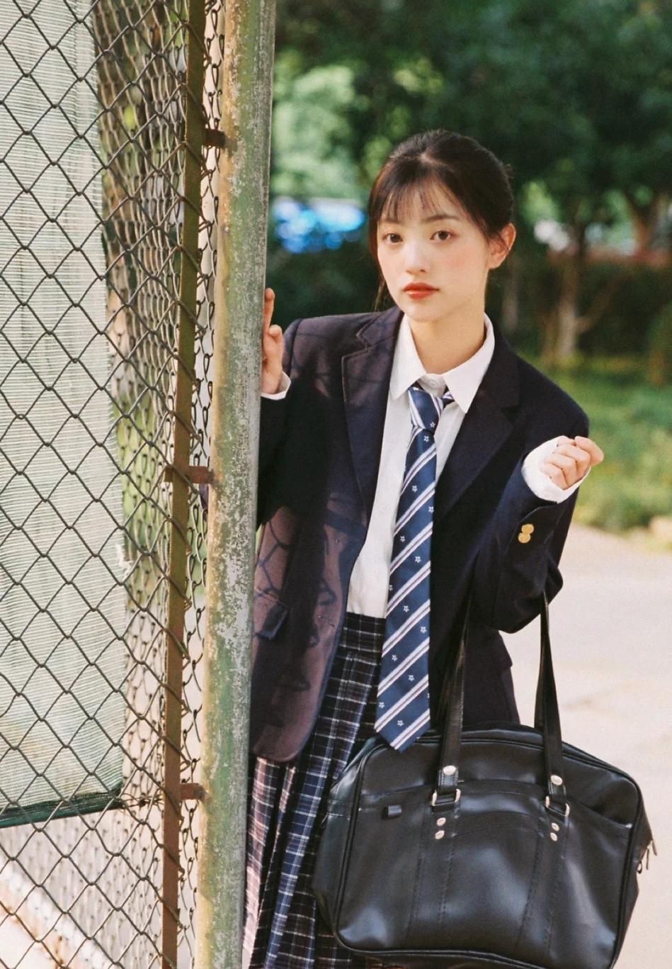 首先我们可以选择在学校的操场上面拍照,春天的下午,温暖的阳光洒在操场上面,我们穿着白色衬衣外面搭一个深蓝色西装外套,深蓝色格子半裙配上同色系的领结,站在操场旁边,手里可以提一个日系包包,看着镜头就可以啦。