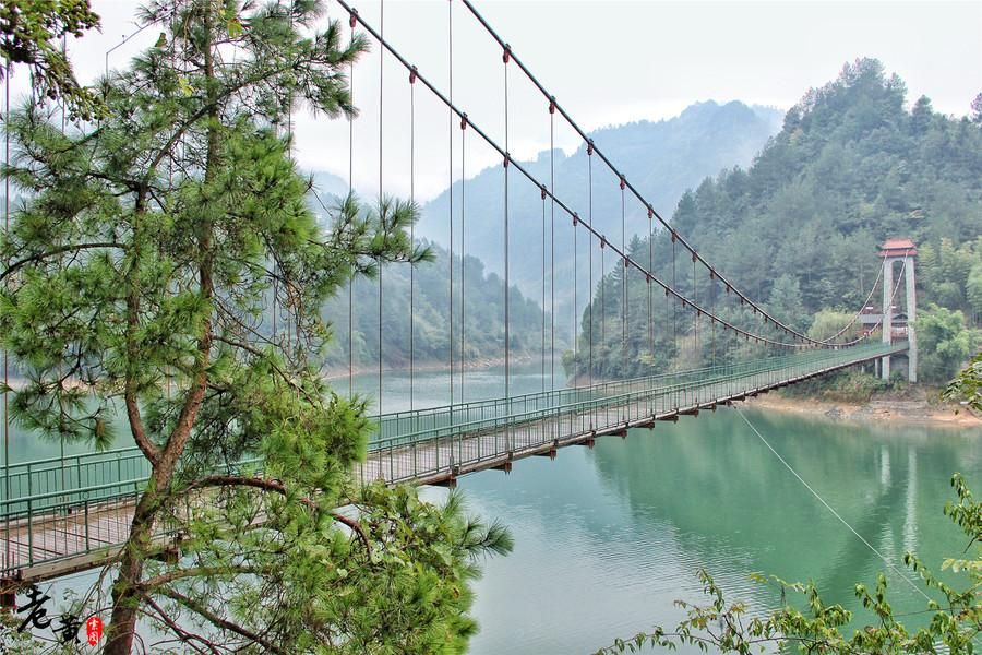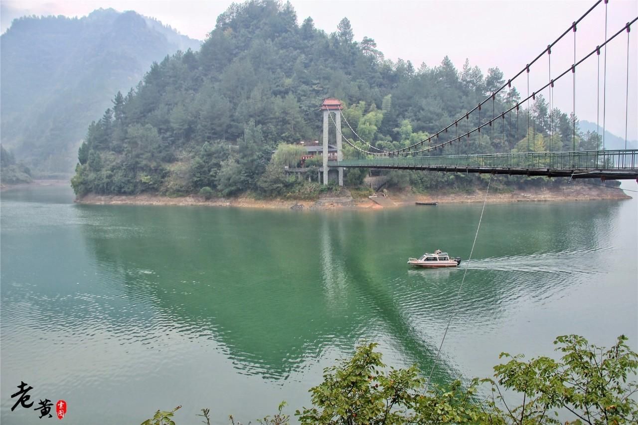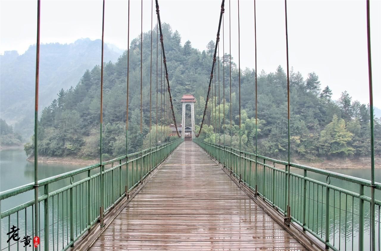 因为雨越下越大,我们没有走太远就想打退堂鼓。但听到当地人说前方有一架索桥,随即又把我们的兴趣点燃。这座索桥有个高大上的名字:鸾凤桥。是架接凤凰山观景台和游船码头的通道。这架桥不过百米有余,但站在桥上可以俯视小南海江面,是取景拍照的不错地方。