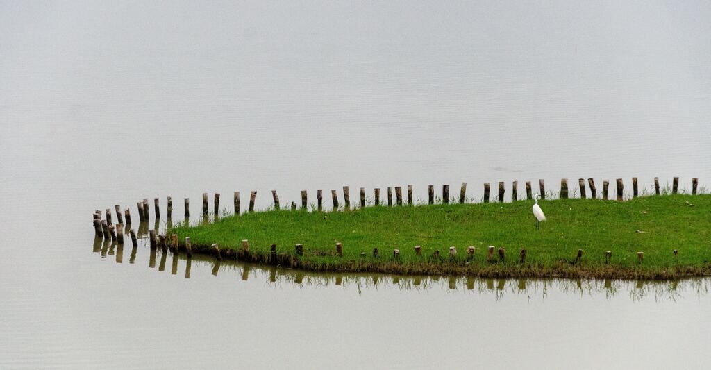 我在那里坐了很久,等到一只苍鹭掠过湖面停在那块浮起的小沙洲上,我拿起相机边拍边担心它会不会很快离开,结果好玩的是,它就在那里静静伫立,好像也在思考,半天动也不动,我脑子里闪过一个念头:这应该是一只哲学鹭, 正思考着晚餐吃什么的人生终极命题。