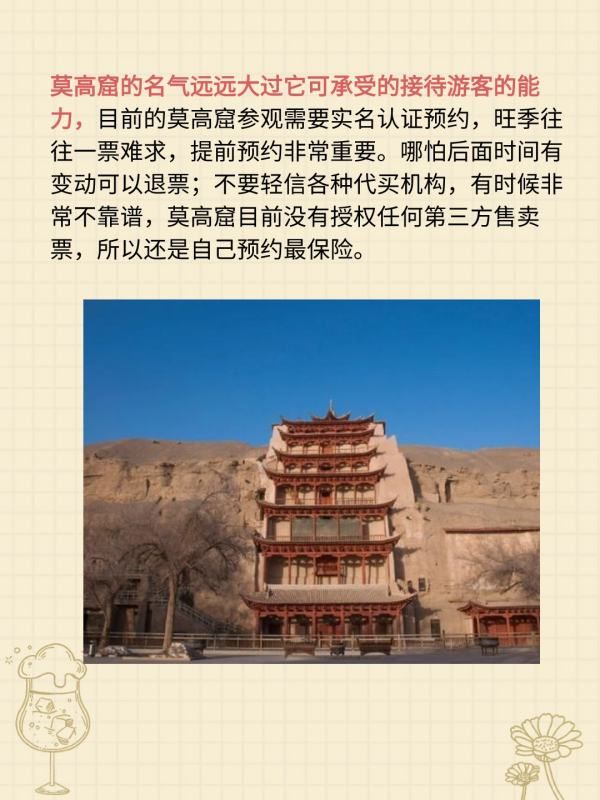 莫高窟的名气远远大过它可承受的接待游客的能力,目前的莫高窟参观需要实名认证预约,旺季往往一票难求,提前预约非常重要。哪怕后面时间有变动可以退票;不要轻信各种代买机构,有时候非常不靠谱,莫高窟目前没有授权任何第三方售卖票,所以还是自己预约最保险。