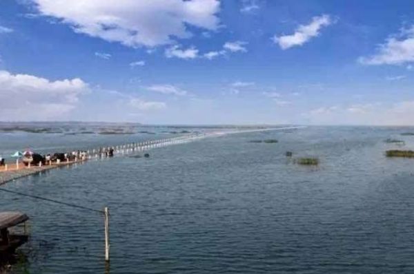 这是一段位于西台吉乃尔湖十公里左右的水上公路,是甘肃青海大环线的一个重要的景点。西台吉乃尔湖位于青海省海西蒙古族藏族自治州大柴旦镇境内,是一个盐湖,一个以卤水为主的特大型锂矿床。G315国道从西台吉乃尔湖中穿过,将湖面劈为两半,形成独特的双色湖。