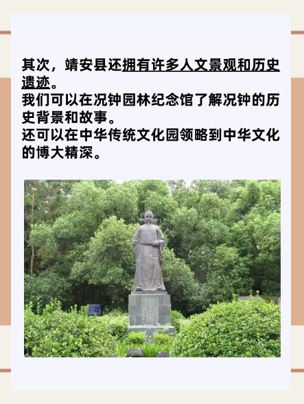 其次,靖安县还拥有许多人文景观和历史遗迹。况钟园林纪念馆是为纪念明代著名清官况钟而建的园林式纪念馆,游客可以在这里了解况钟的历史背景和故事,感受这位古代清官的伟大人格魅力。中华传统文化园则致力于传承和弘扬中华优秀的传统文化,游客可以在这里领略到中华文化的博大精深。