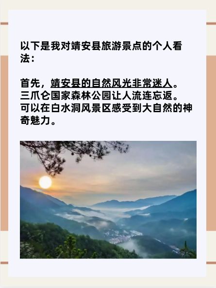 靖安县位于江西省宜春市,是一个拥有丰富自然景观和人文资源的地方。以下是我对靖安县旅游景点的个人看法: