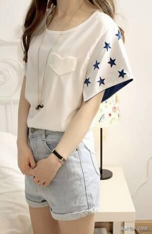 炎热的夏季T恤搭配上短裤五一是很好看的装扮,此款T恤十分的独特,采用了蝙蝠袖的设计,两只袖口点缀了星星,胸前的口袋采用了心型的设计,4月去马尔代夫带上这样一款韵味十足。