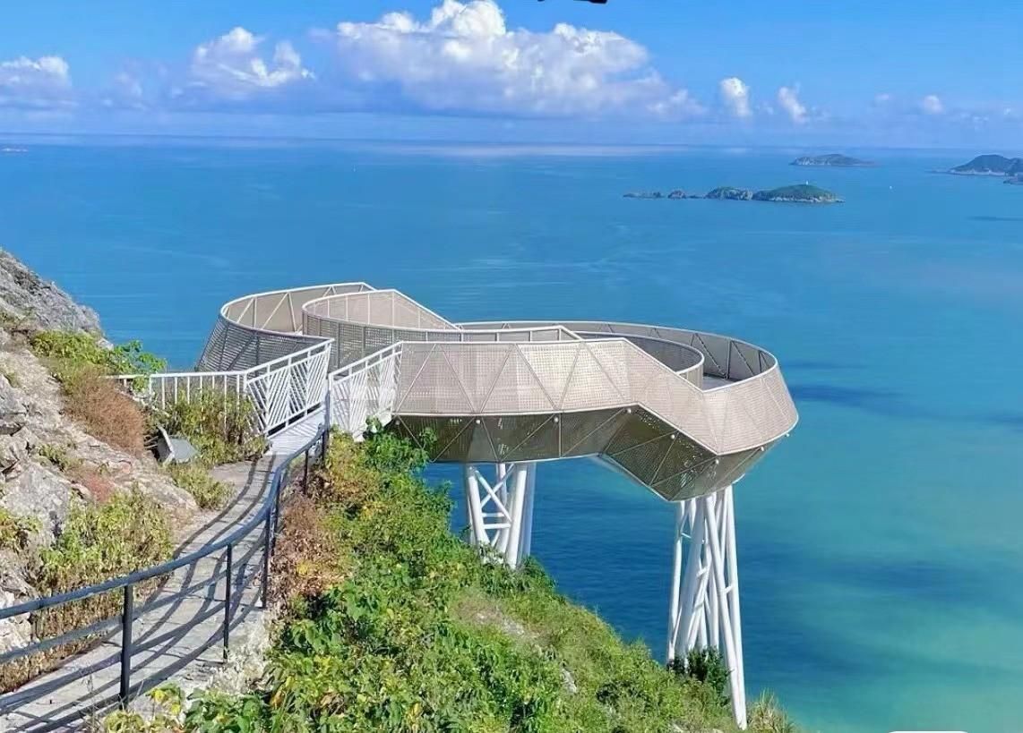 从滨海绿道坐观光车出发,绿道景色很好,全程8公里长,建议乘坐观光车游玩,观光车不限次数往返30元,途中经停对戒观景台,珍珠滩等,可以随时在想去的景点下车,玩完后再继续观光车抵达下一个景点。