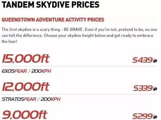 新西兰能跳伞的地方有好几个,价格各有不同,下面是南岛Queenstown 跳伞收费标准