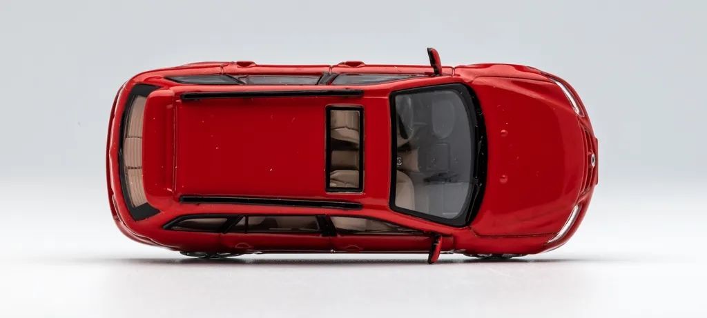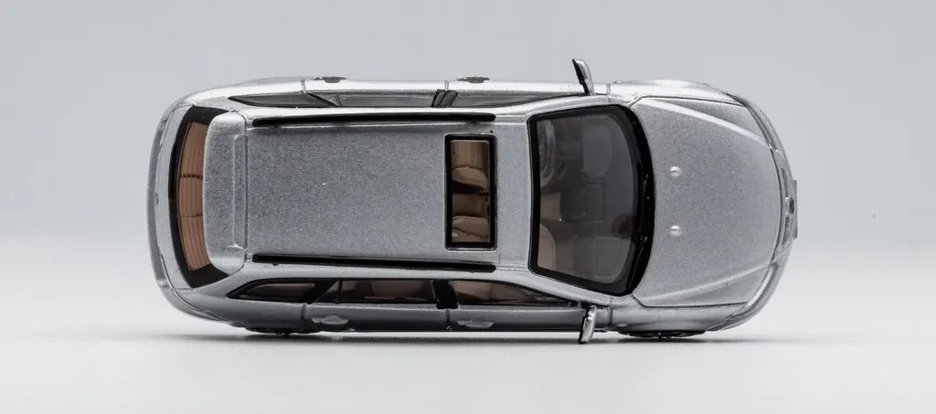 模型整体漆面质感中规中矩,和100元以上的产品有一些差距;模型有做天窗,内饰座椅为浅棕色,中控台为黑色,内饰刻画细节还算丰富;而车顶的行李架是独立分件的,前盖上有雨刮喷水口,不过有点肉。