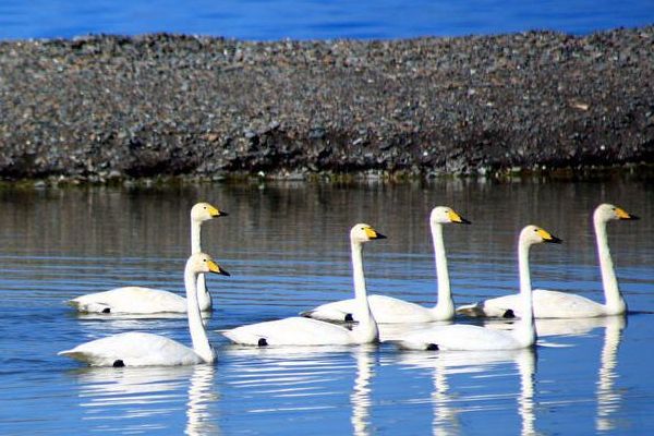 荣成成山卫天鹅湖位于成山镇境内,是中国北方最大的天鹅湖。这里明清时为防务要地,明末曾试图在这里开凿至朝阳港的运河。近世由于泥沙淤积,港湾逐渐变成半封闭的椭圆形泻湖。湖内面积有6.3平方公里,平均水深为2米,最深不过3米,一月份平均水温为0.9℃,湖面很少结冰。