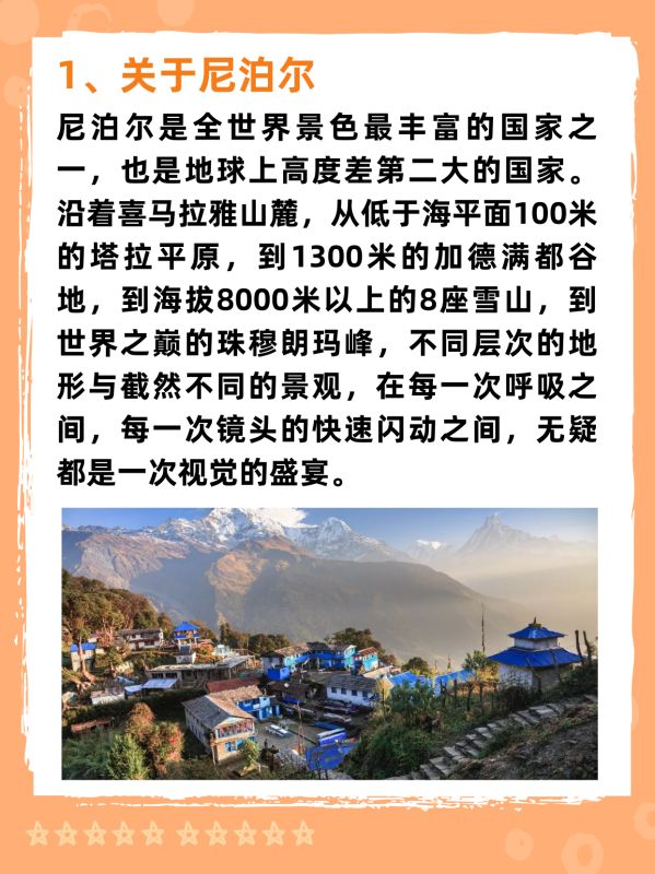 尼泊尔是一个充满神秘和魅力的国家,拥有壮丽的自然风光、丰富的文化遗产和独特的民族风情。以下是一些游玩攻略分享:
