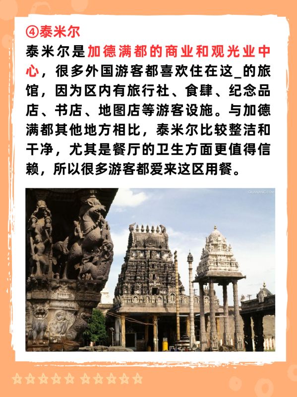 泰米尔是加德满都的商业和观光业中心,很多外国游客都喜欢住在这_的旅馆,因为区内有旅行社、食肆、纪念品店、书店、地图店等游客设施。