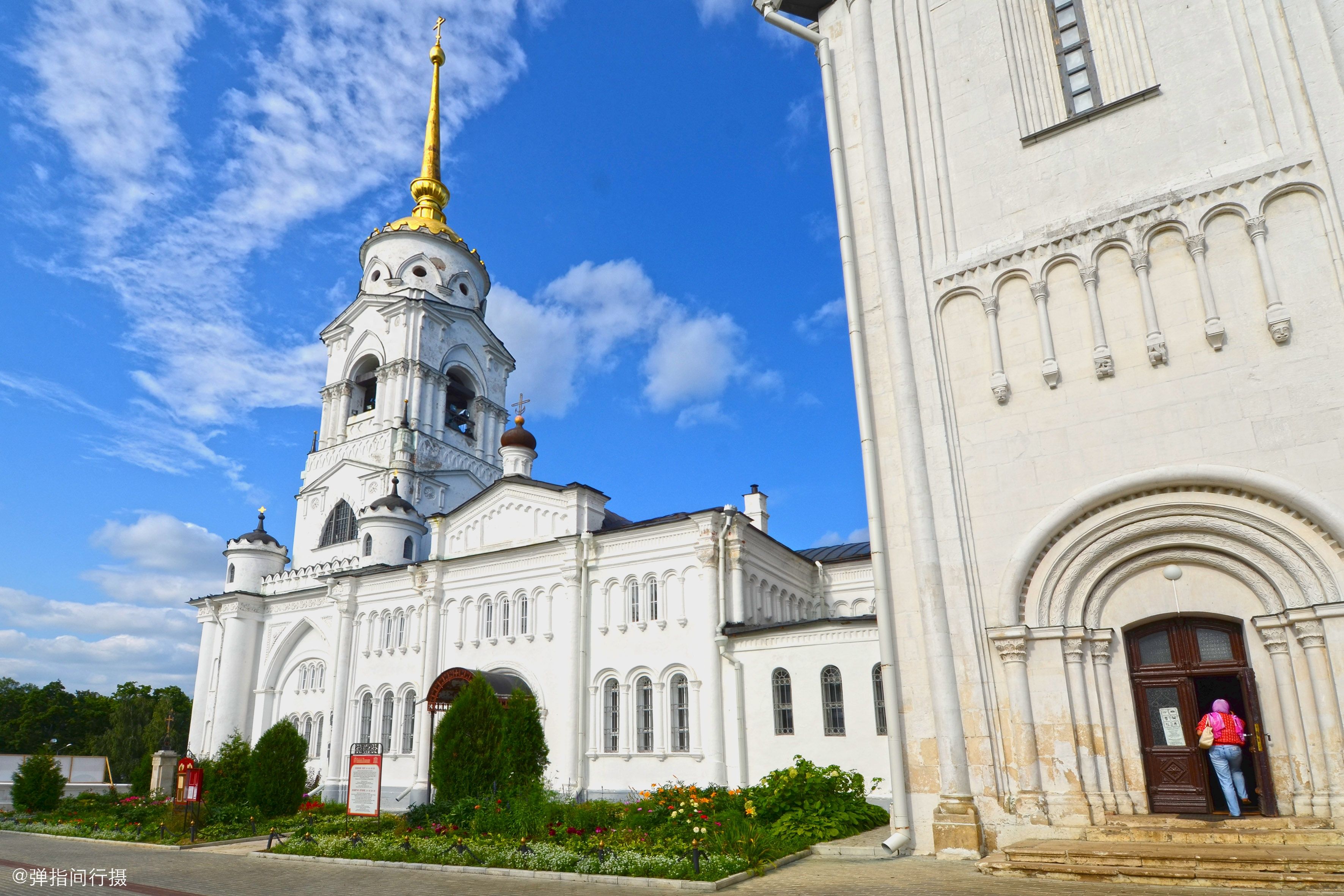 坐落在克利亚济马河岩陡峭高地上的圣母升天大教堂是弗拉基米尔古建筑的典型,这座教堂建于12世纪,是俄罗斯现存最古老的教堂。在12到15世纪期间,沙皇都在此加冕。一座高耸挺拔的白色钟楼和五个“洋葱头”镀金圆顶,成为后期俄罗斯东正教堂建筑的模板。