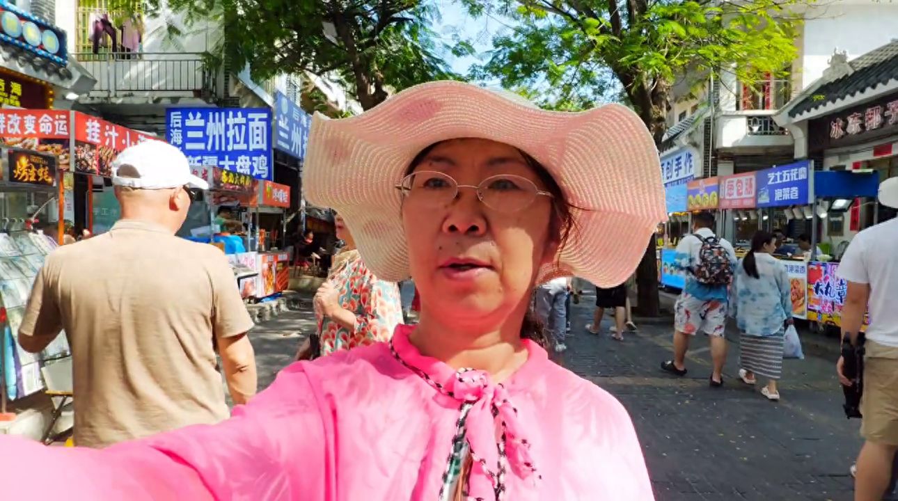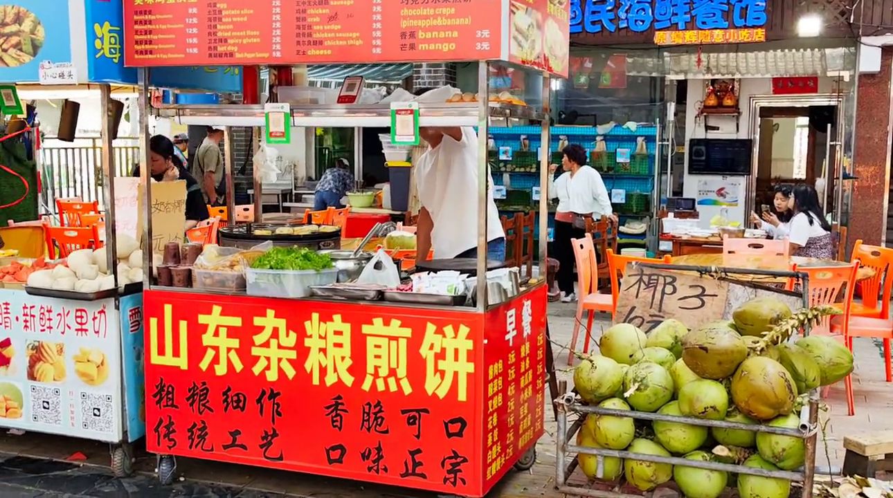 先逛步行街,这里有新疆的馕、当地的椰子下蛋,还有巴西烤肉、杨丽萍官方服饰、山东的杂粮煎饼、后海文创,这是照相的地方。后海故事、三亚后海美食街等等。