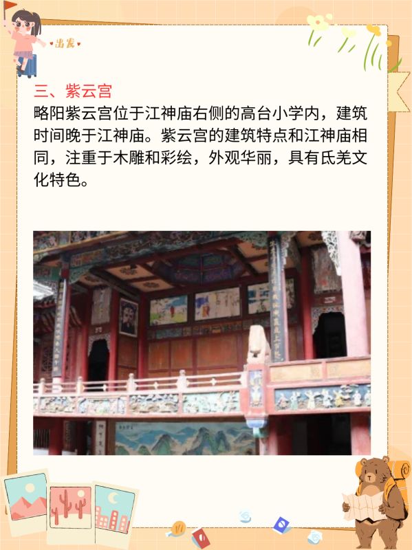 紫云宫的建筑特点和江神庙相同,注重于木雕和彩绘,外观华丽,具有氐羌文化特色。