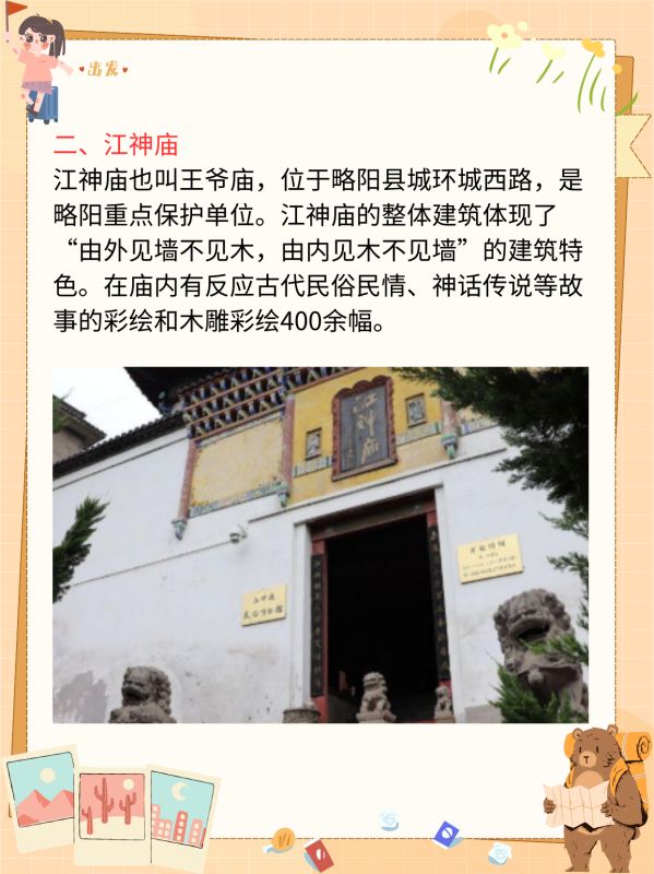 江神庙也叫王爷庙,位于略阳县城环城西路,是略阳重点保护单位。江神庙的整体建筑体现了“由外见墙不见木,由内见木不见墙”的建筑特色。