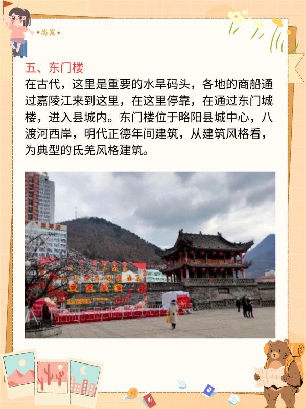 东门楼位于略阳县城中心,八渡河西岸,明代正德年间建筑,从建筑风格看,为典型的氐羌风格建筑。