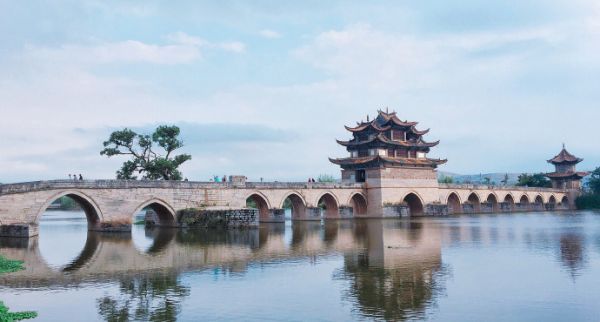 双龙桥,俗称“十七孔桥”,横跨泸江与塌冲河交汇之水面上,是座三阁十七孔大石拱桥。这座桥被认为是云南省规模最大、艺术价值最高的一座多孔连拱桥,已列入中国造桥史册。