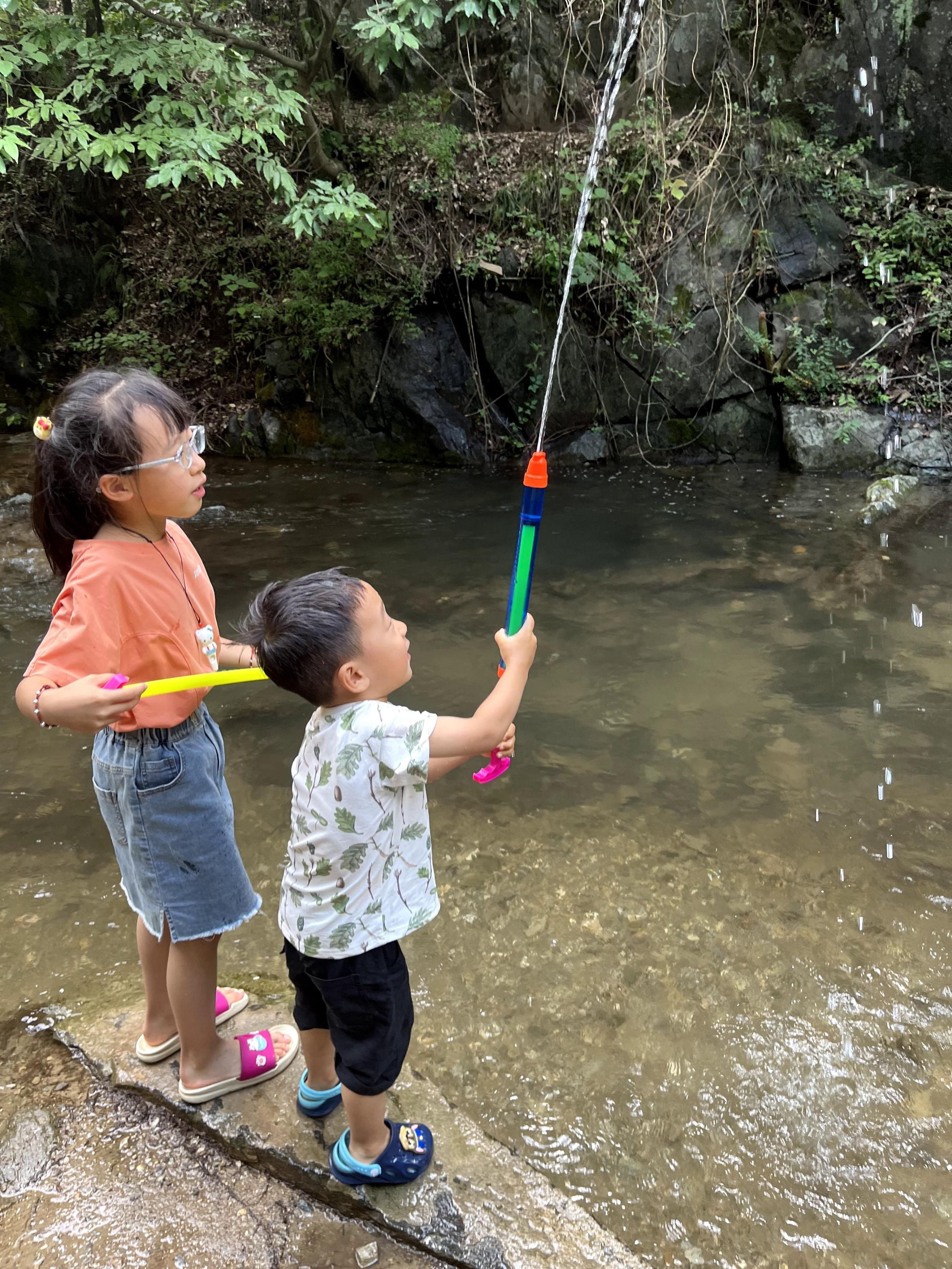 民宿旁边有条小溪,里面还有小鱼,我和姐姐在小溪边一起玩水