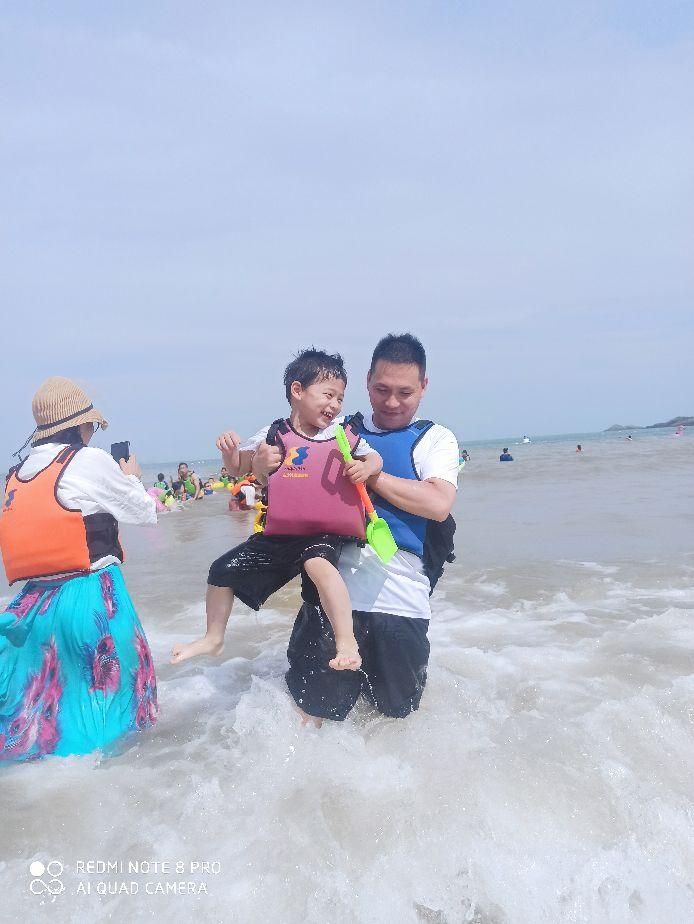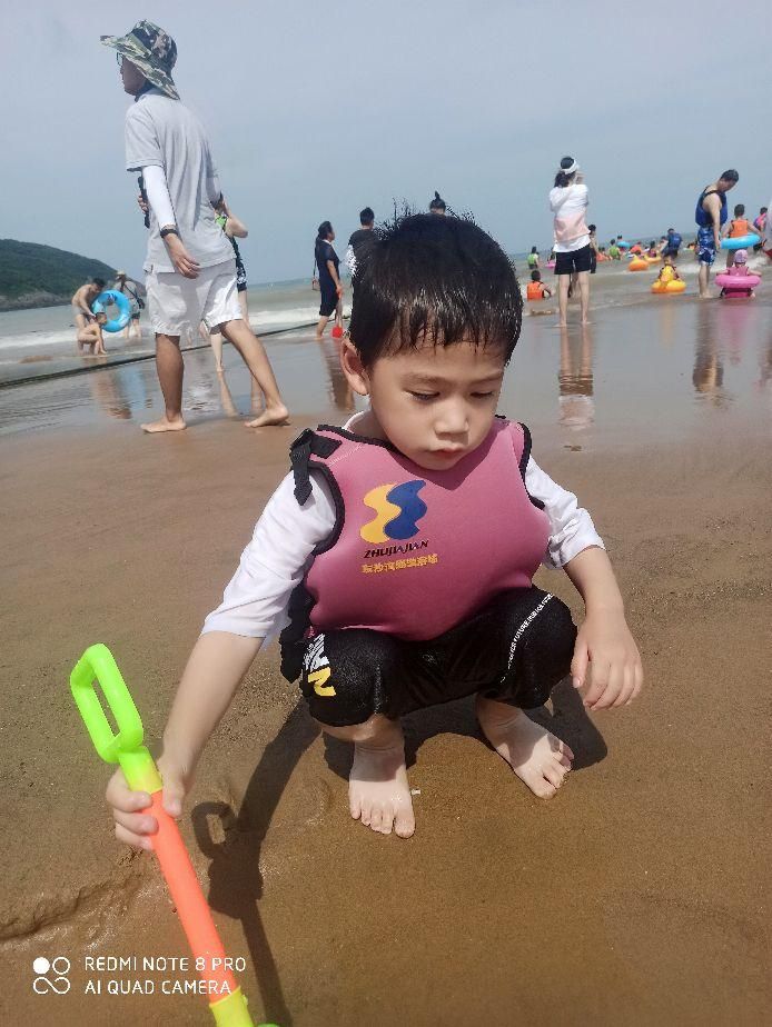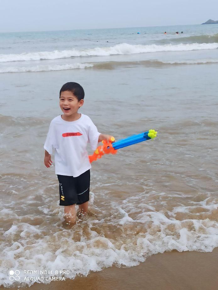 中午打车到东沙吃了饭,就赶到东沙沙滩浴场门票35元每人,还买了水枪和挖沙的工具。东沙沙滩长有1000米左右,离路边有10米左右的干沙区,脚踩上去酥酥软软的也很温暖,潮湿的沙滩脚感平整。我们本来打算是不下水的,晚上去南沙游泳的。但是孩子们玩的嗨了,都下水了,我也跟着下水了。虽然今天没有太阳,温度也不高,但是我们玩了一个多小时,胳膊就晒红了。记得一定要做好防晒!